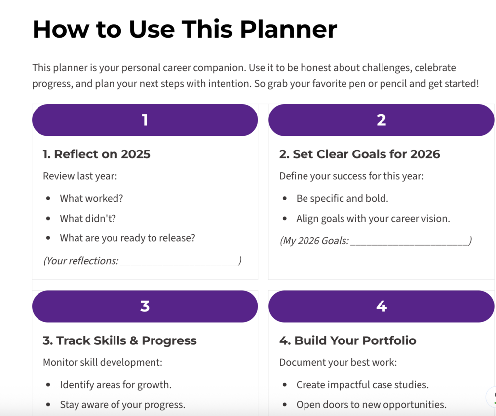 A simple, powerful planner designed for Learning & Development professionals, Instructional Designers, and transitioning educators who want clarity and direction in the new year. Get focused with your 2025 reflection, Big 5 goals, monthly planning pages, skills and portfolio trackers, and a clean job search section.